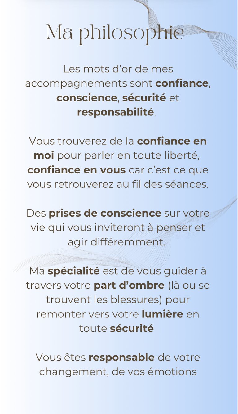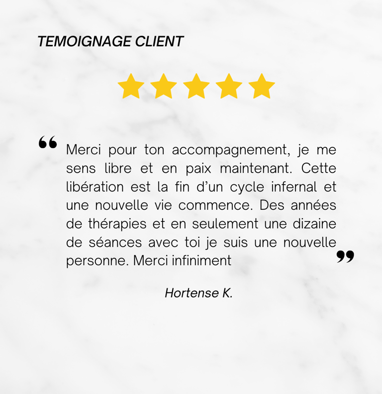 Mon approche allie Hypnose, Ritmo (EMDR), Énergétique, Psychogénéalogie, Neurofeedback Dynamique, Thérapie IFS, PNL, autrement dit les séances peuvent être intenses, des prises de conscience émergent.