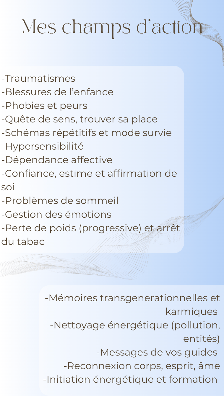 Les séances peuvent inclure la rééquilibration des centres énergétiques, la libération des blocages émotionnels, messages de vos guides ou défunts.